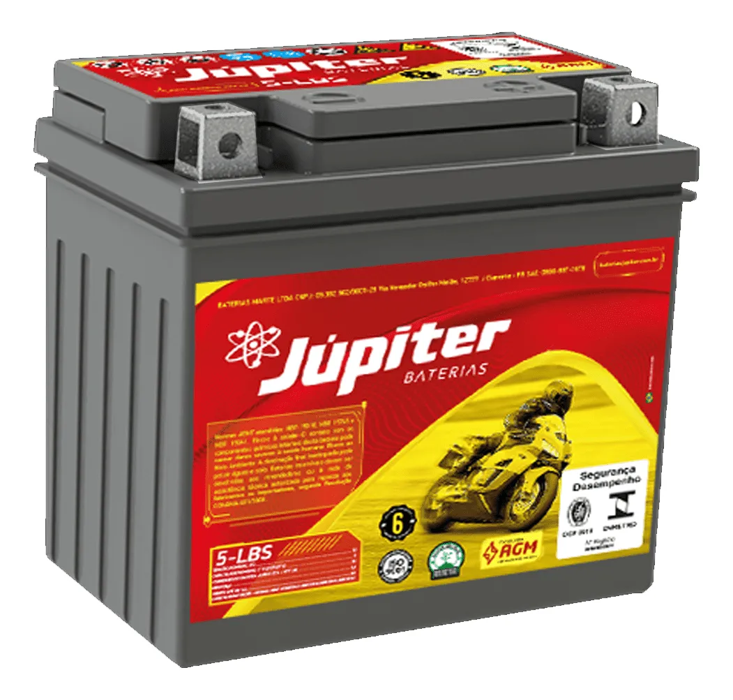 Bateria Júpiter 5-JLBS para moto, nova, com tecnologia de ponta para maior segurança e desempenho. Ideal para quem busca qualidade e confiabilidade. VALOR A BASE DE TROCA GARANTIA DE 6 MESES – ESPECIFICAÇÕES TÉCNICAS: Modelo: JJ-5LBS; Ref. Yuasa: YTX5L-BS; Ref Moura: MA5-D; Tensão Nominal/Voltagem: 12 volts; Capacidade Nominal C10 (AH): 5; Capacidade de Pico (CCA): 50; Tempo até 6V (SEG): 50; Polo positivo: Direito; Dimensões (CxLxA): 11,3 x 7,0 x 10,5; Peso (KG) (+/- 5%): 2kg