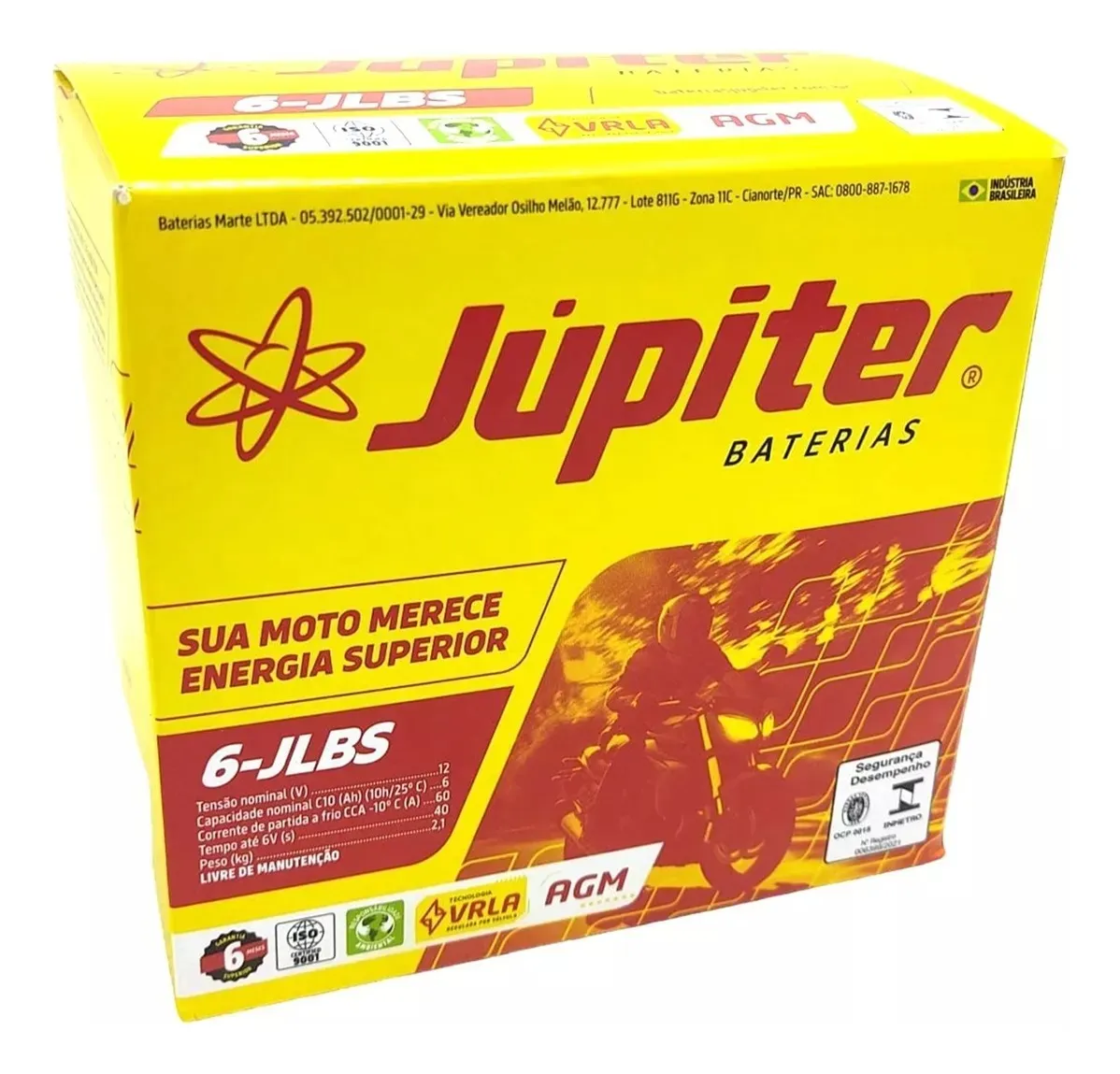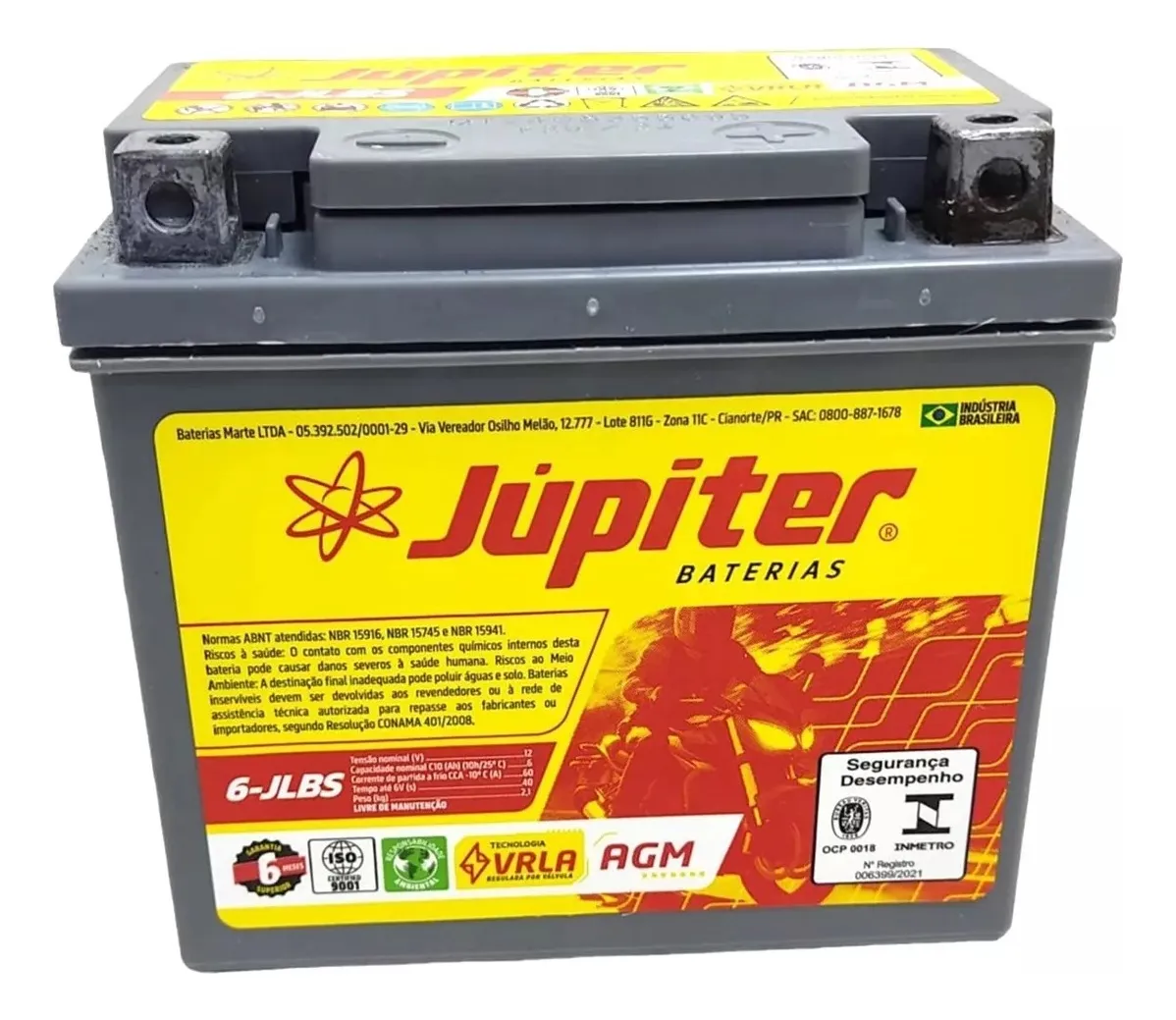 VALOR A BASE DE TROCA GARANTIA DE 6 MESES ESPECIFICAÇÕES TÉCNICAS: Modelo: JJ-6LBS; Ref. Yuasa: YTX5L-BS/YTX6L-BS; Ref Moura: MA5-D/MA4-D; Tensão Nominal/Voltagem: 12 volts; Capacidade Nominal C10 (AH): 6; Capacidade de Pico (CCA): 60; Tempo até 6V (SEG): 60; Polo positivo: Direito; Dimensões (CxLxA): 11,3 x 7,0 x 10,5; Peso (KG) (+/- 5%): 2,1kg